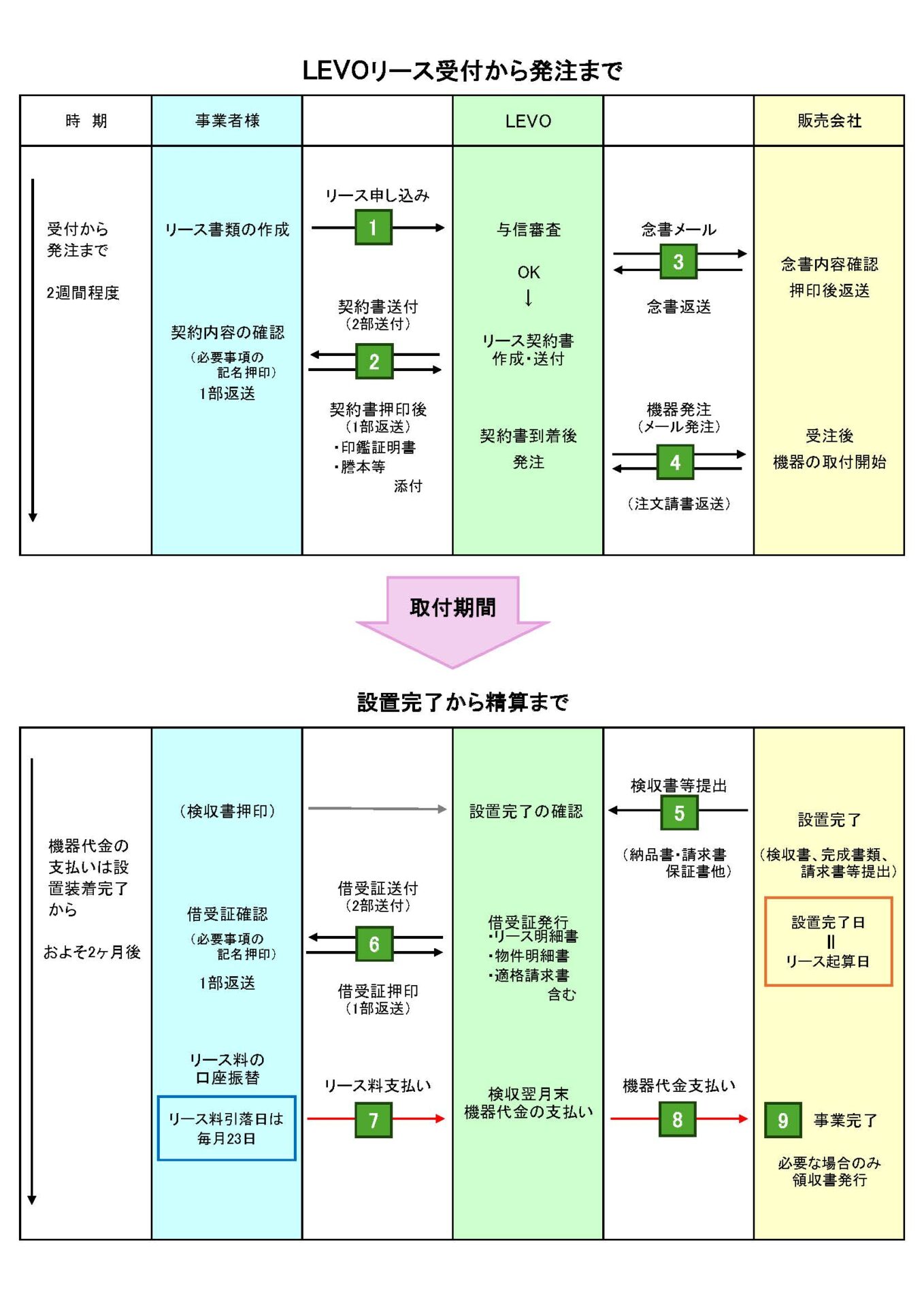 LEVOリースの受付から機器代金の支払いまでを示します。
